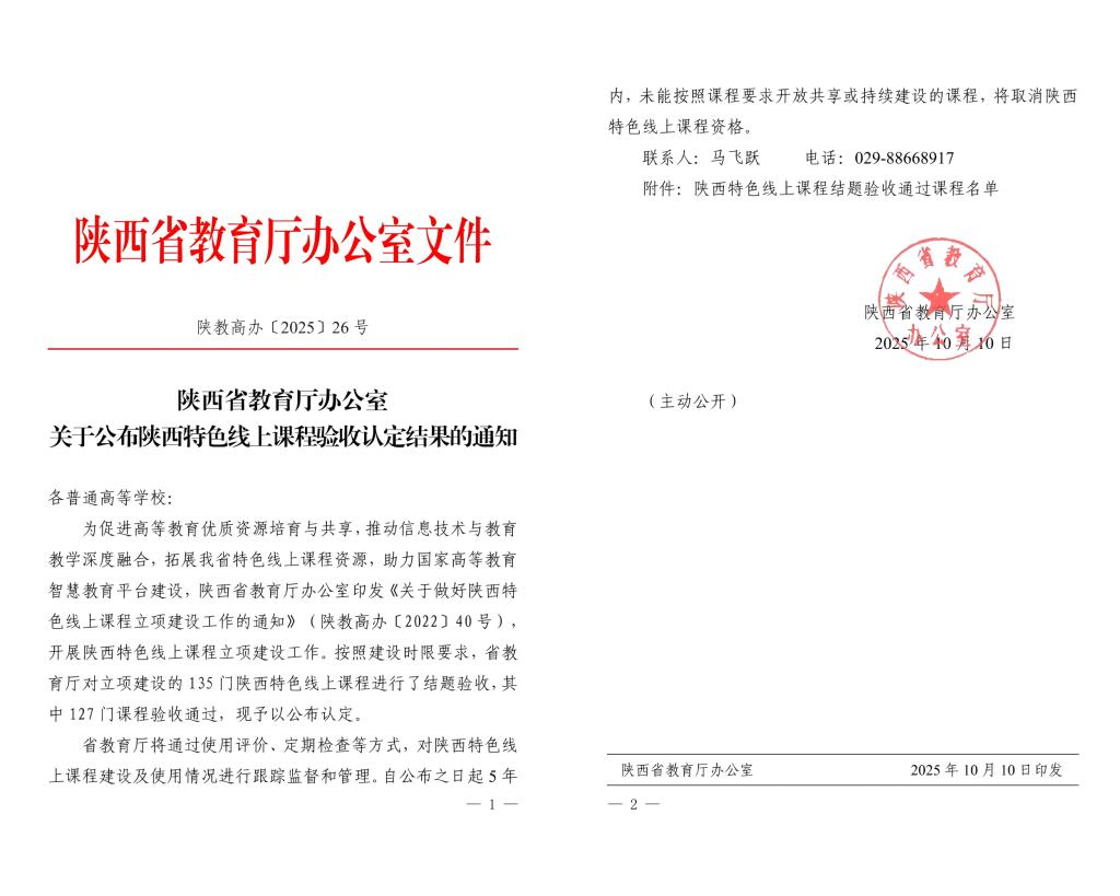10月10日,陕西省教育厅办公室发布《关于公布陕西特色线上课程验收认定结果的通知》,由我院省级思政课“教学标兵”团队主持讲授的陕西特色线上课程《近代陕西历史人物十讲》顺利通过教育厅结项验收。