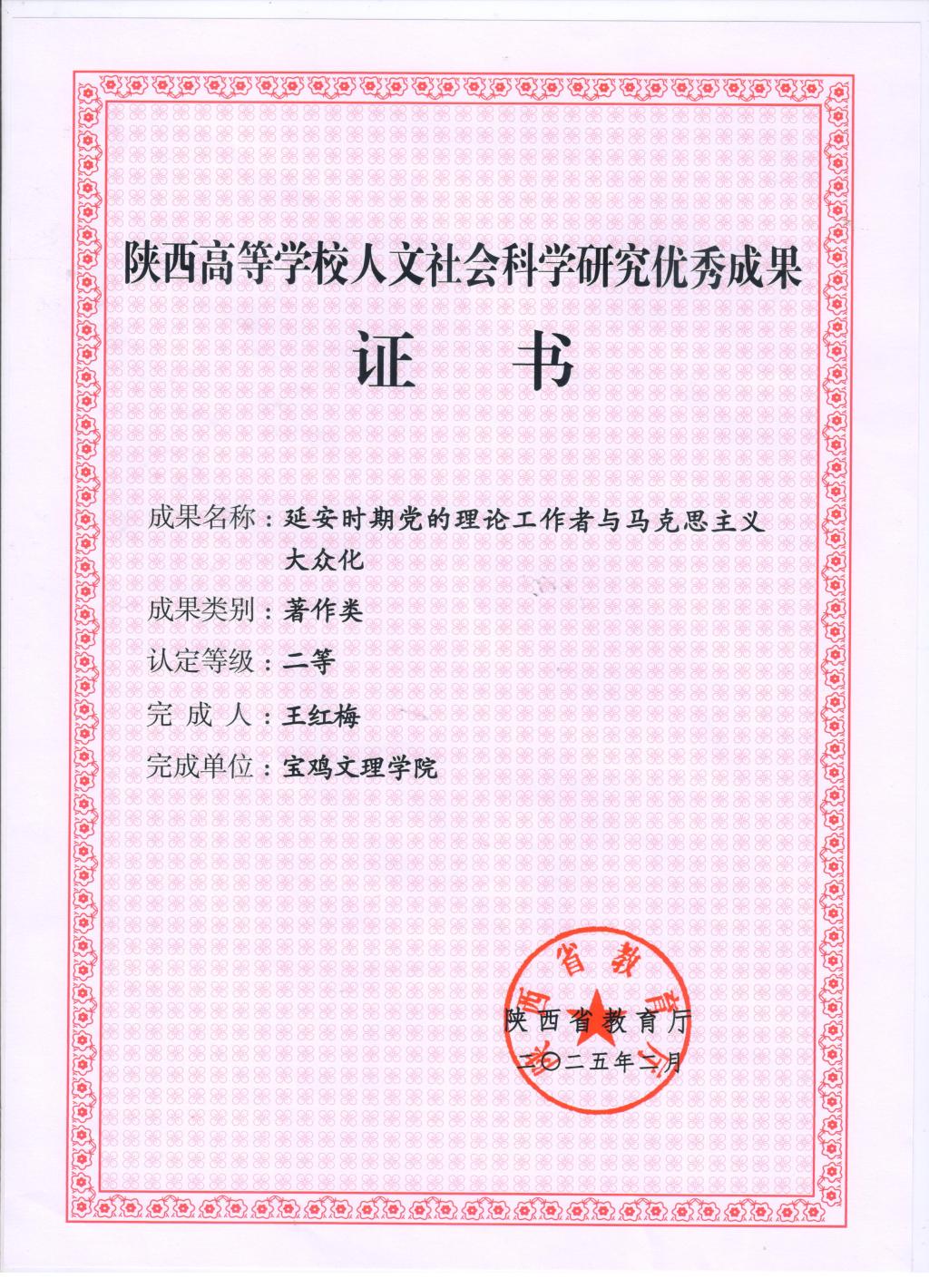2月,陕西高等学校人文社会科学研究优秀成果奖揭晓,我院王红梅教授的著作《延安时期党的理论工作者与马克思主义大众化》获二等奖。