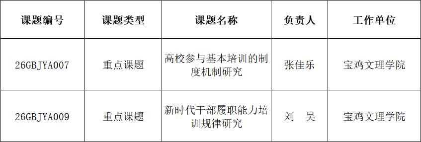 近日,延安大学官网发布了《关于2026年陕西省高等学校学科创新引智基地“干部教育国际交流引智基地”、陕西高校青年创新团队“红色资源与干部教育研究协同创新团队”联合开放课题立项的通知》,我院2024级硕士研究生刘昊、2025级硕士研究生张佳乐分别申报的“新时代干部履职能力培训规律研究”“高校参与基本培训的制度机制研究”课题获准立项。