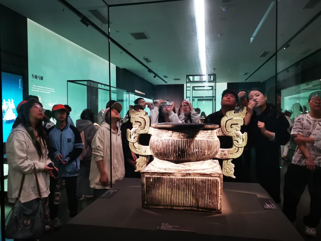 在讲解老师的带领下,同学们有序参观了各个展厅,认真观摩了何尊、逨鼎、折觥、秦公镈等珍贵文物,仔细聆听了“宅兹中国”、四十三年逨鼎中四个“毋敢”等铭文背后的故事,感受古人的匠心智慧以及周秦文化的博大精深。同学们通过近距离感受青铜文明,既增长了学识,还进一步增强了文化自信。