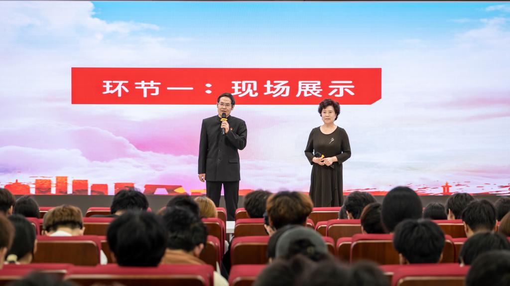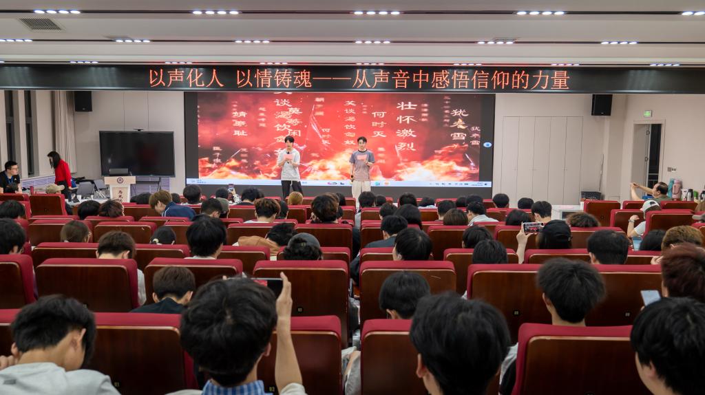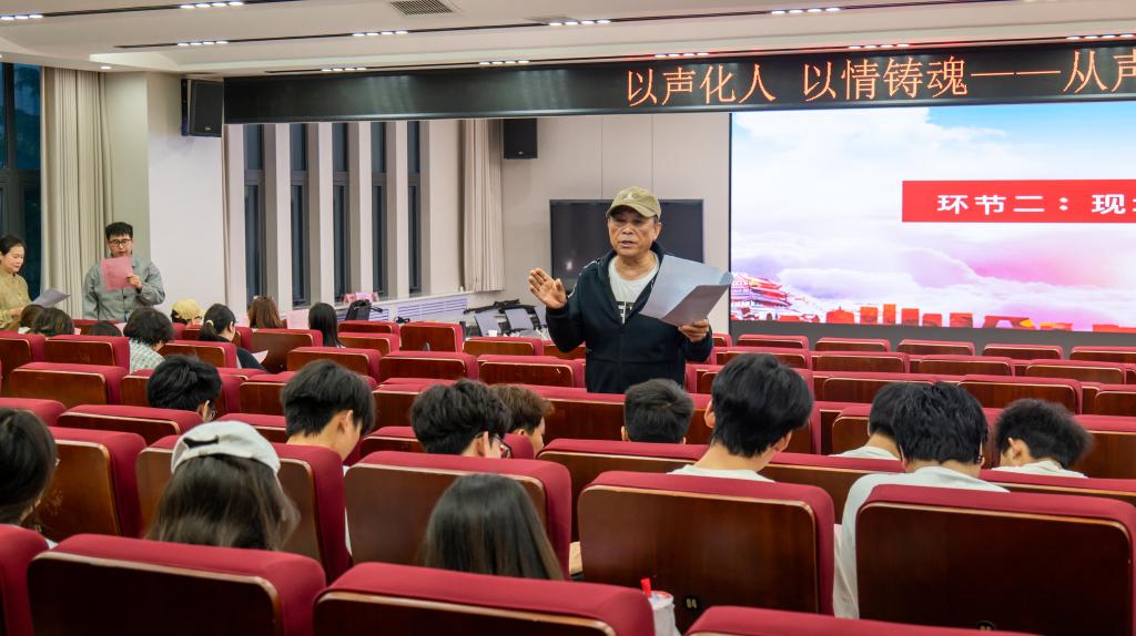 教学活动共分为三个环节。第一个环节为现场展示,协会的六位老师依次登台,倾情演绎红色经典篇目。他们以声传情、以诵育人,凭借饱满的情感、沉稳的气场与铿锵的语调,生动演绎一段段红色篇章,带领同学们跨越时空感悟历史,深切体会红色文化的深厚底蕴和永不磨灭的精神力量。