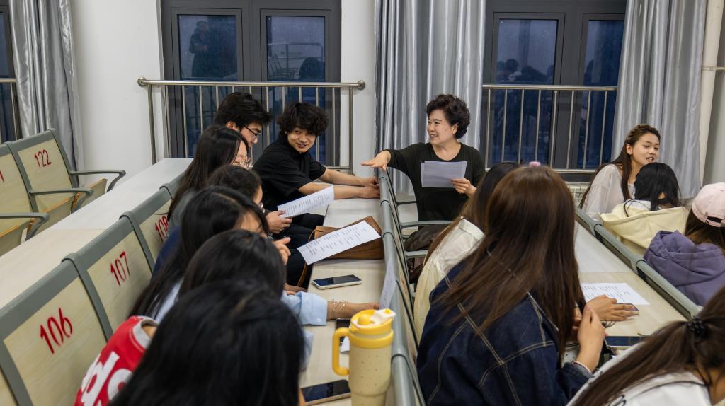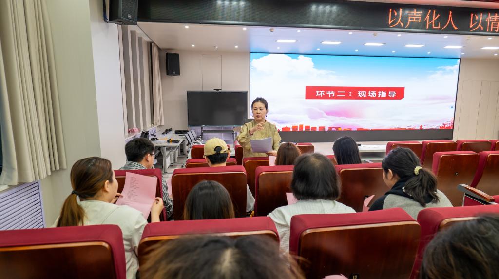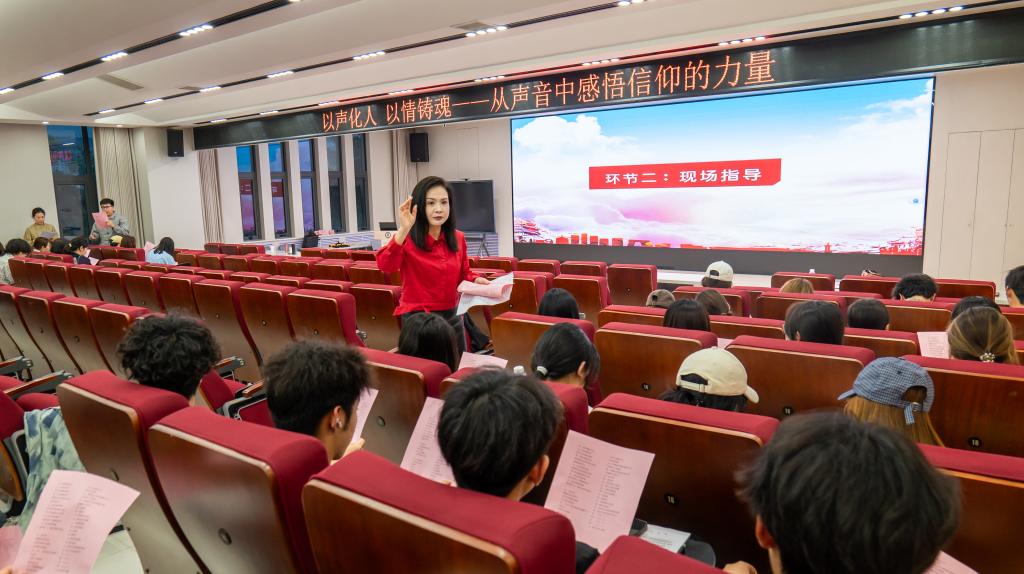 第二个环节为现场指导。全体同学分为六个小组,选择《那是我的祖国》《不朽》《英雄》《我是中国人》《沁园春·雪》《满江红》等作品,分别由六位老师分组进行指导。老师们不但在情感把控、气息调节、节奏停顿、语句重音、情感表达等实用技巧等方面给予学生悉心地指点,而且对作品的时代背景、历史事件及人物故事进行了深入的解读,帮助学生更好地理解作品,理解文字背后的忠诚、坚守与拼搏。