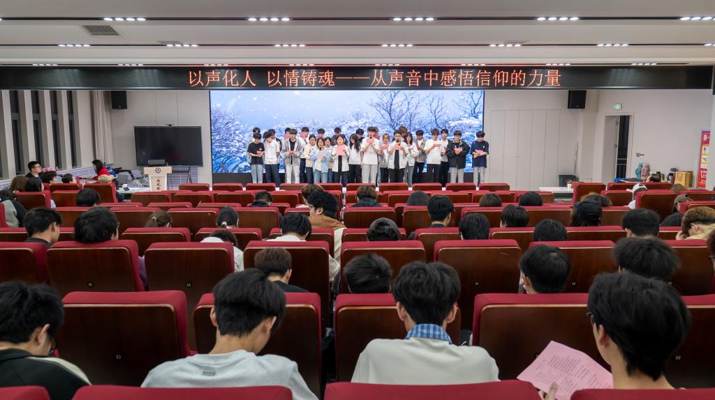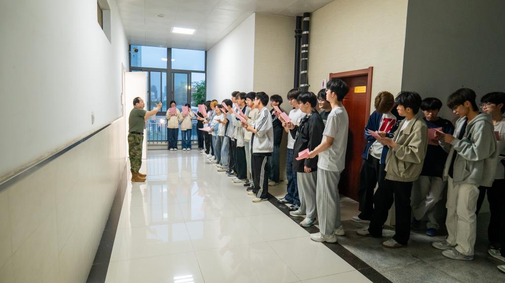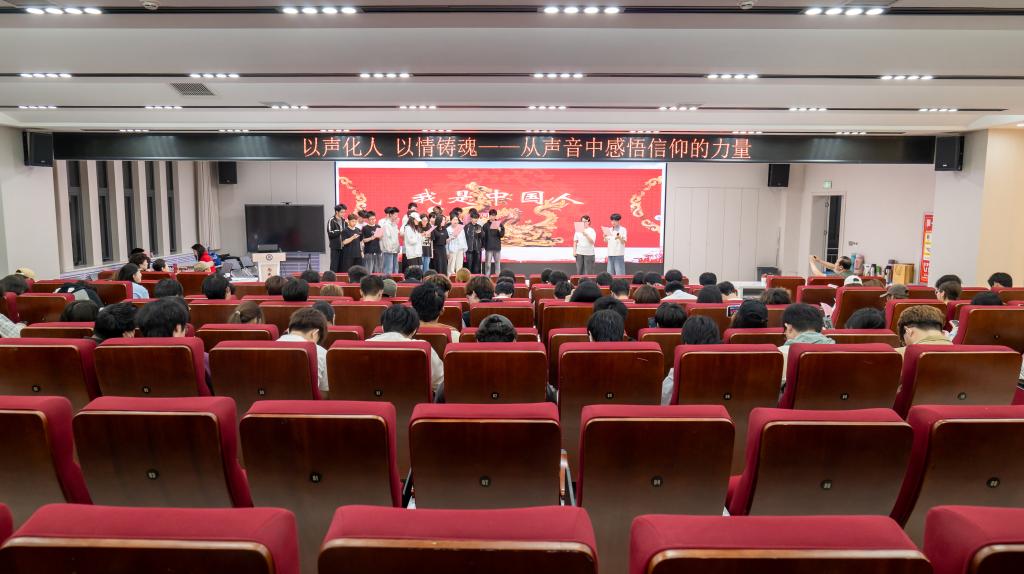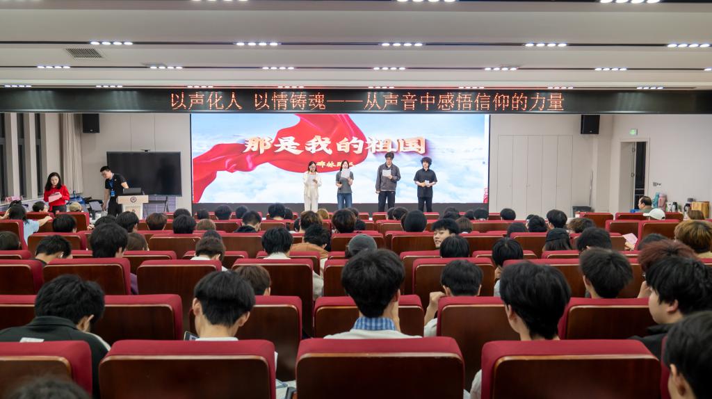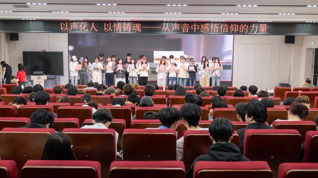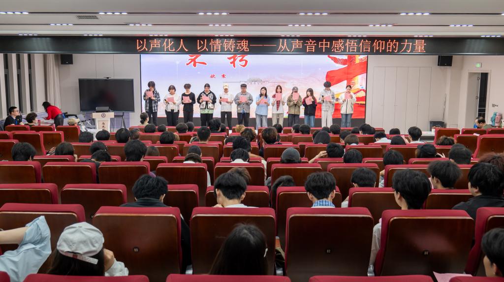 第三个环节为分组示范。在老师的正确引领与耐心辅导下,同学们全身心投入练习,积极交流心得、反复打磨细节,将所学技巧融入诵读演绎,以饱满的热情准备成果展示。通过抽签各小组依次登台进行汇报展演,此刻,同学们的朗诵不再是空洞的口号或生硬的背诵,而是被注入了灵魂与情感。当大家齐声高诵时,声音层次分明又浑然一体,时而如涓涓细流诉说家国情怀,时而如惊雷滚滚迸发信仰的力量。他们以青春之声致敬家国、缅怀英雄、礼赞时代,在沉浸式的亲身实践中领悟红色文字、诠释经典作品中的家国情怀与精神内核,汲取精神养分,完成红色精神的薪火相传。