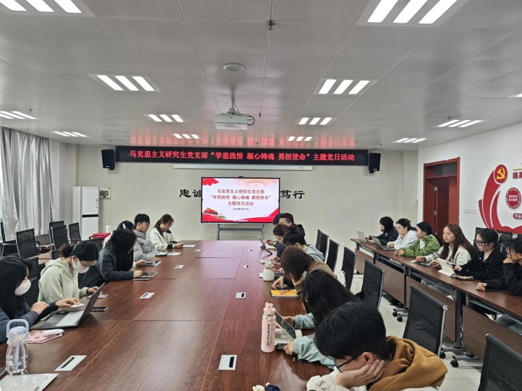 为深入学习贯彻习近平新时代中国特色社会主义思想,强化理论武装,4月21日上午,马克思主义学院研究生党支部在高新校区博文楼1201会议室开展“学思践悟 凝心铸魂 勇担使命”主题党日活动,全体党员,入党积极分子参加活动。活动由研究生党支部组织委员李梦瑶主持。